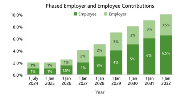 We are now moving into the second phase of the transitional arrangements for secondary pensions. This will see the joint minimum contribution rate increase gradually from 2% to 10% by 2032. The first increase comes into effect on 1 January 2026, with the minimum joint employer/employee contribution rate increasing by 0.5% to 2.5%.
